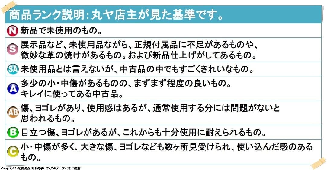 ◆補足情報:ヌメ革部分に擦れや色ムラこそあるものの、その他に特筆すべきダメージは見受けられず、まだまだお使い頂けるコンディションと思われますので、通常使用されていた中古品=ABランクと評価させて頂きました。
